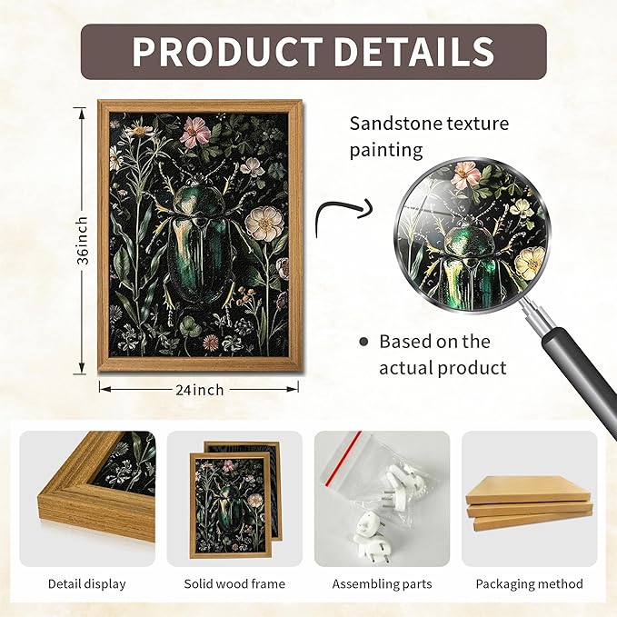 Framed Vintage 3D Textured Wall Art - Gothic Dark College Beetle Wall Decor - Hand Drawn Sandstone Nature Botanical Pictures for Living Room Bedroom Home Decor 24x36in