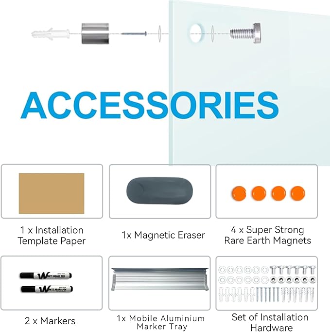 - Super Strong Magnets: Unlike the traditional aluminum frame whiteboard, our glass board needs stronger magnetic power. For the best experience, use magnets that we have provided you with super strong magnets (Not applicable: fridge magnets and normal black magnets)