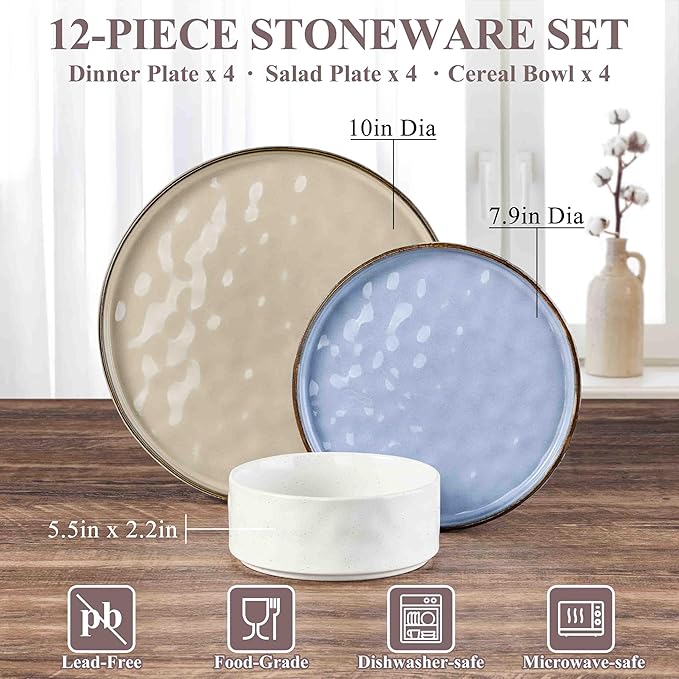 - Healthy and Sturdy Material, the stoneware set boasts a sturdy construction, crafted from natural clay and food grade glazes, fired at a high heat up to 2340°F for long-lasting use, chip and scratch-resistant, made of lead-free and cadmium-free materials, it ensures that your dining experience is safe without any harmful substances