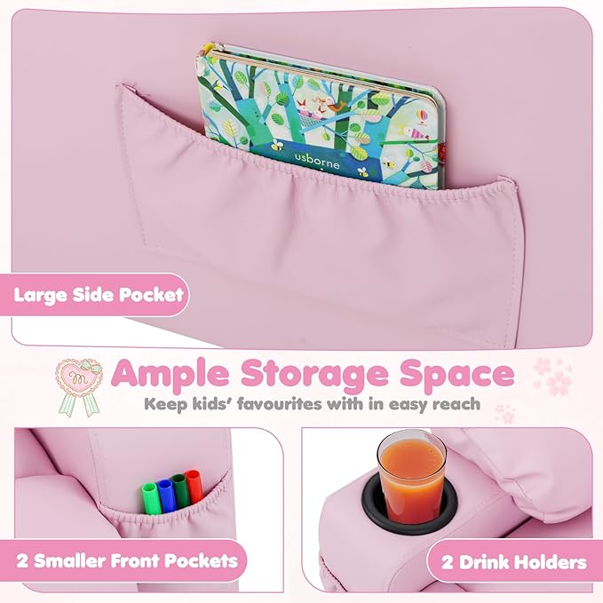 - [Considerate Design]: This kids lounger chair is equipped with a cup holder and 2 side pockets, allowing your kids to pick up the water conveniently. In addition, the 2 side pockets can accommodate different items, such as books and snacks.