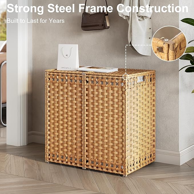 - WATERPROOF, BREATHABLE & HEAVY-DUTY:Crafted with waterproof PP rattan, this laundry hamper keeps clothes dry and ventilated. Its reinforced metal frame supports up to 66 lbs. Ideal for humid spaces or heavy loads—combining airflow, strength, and spill-proof reliability