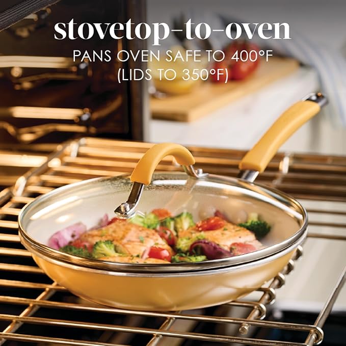 Rachael Ray Cucina Ceramic Cookware Set - 13 Pieces - Ceramic Pots and Pans Set w/Nonstick Frying Pans, Saute Pan, Saucepans, Stockpot, Lids, Pan Protectors & Cooking Utensils - Turmeric