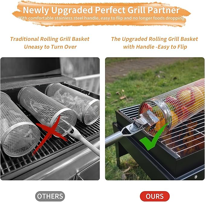 Rolling Grill Baskets (2PCS), 304 Stainless Steel, Silver, Round, Perfect for Veggies, Shrimp, Meats, Father's Day Gift