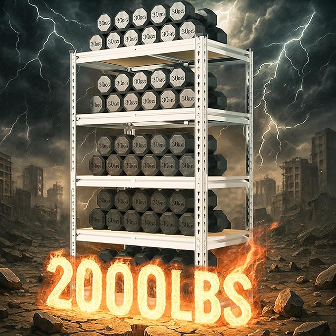- 【2000LBS Storage Shelves】Turn a cluttered garage into a tidy and organised space with our garage shelving. With a total weight capacity of 2,000 lbs, you can stack tools, supplies, or whatever you need in your garage or storage area. Each shelf has an extra sturdy metal support bar underneath (5 in total), and the thickened metal posts and beams provide greater support to prevent this heavy duty storage shelf from warping and bending
