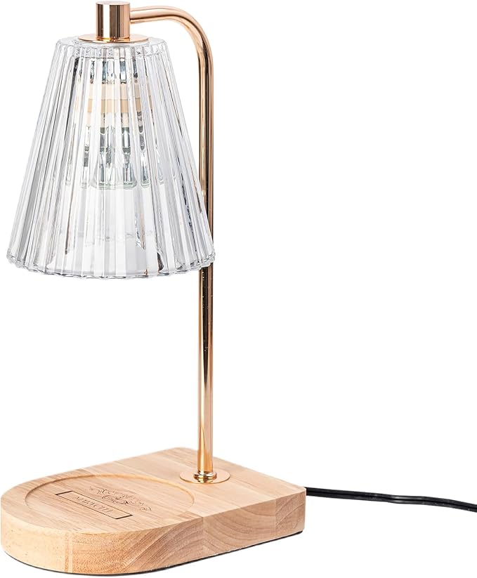 - Dream Home Decor Aesthetic: This candle warmer lamp is a harmonious fusion of a rustic wooden base, sparkling,clear ribbed glass lampshade elegant curved champagne gold pole stylish with every aesthetic and home decor, seamlessly bridging classic charm with modern sophistication.