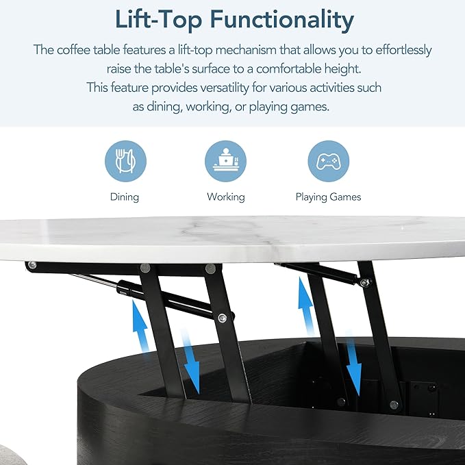 - ☕【Lift-Top Functionality】The coffee table features a lift-top mechanism that allows you to effortlessly raise the table's surface to a comfortable height. This feature provides versatility for various activities such as dining, working, or playing games. The lift-top function is convenient and secure, ensuring stability when the table is elevated.