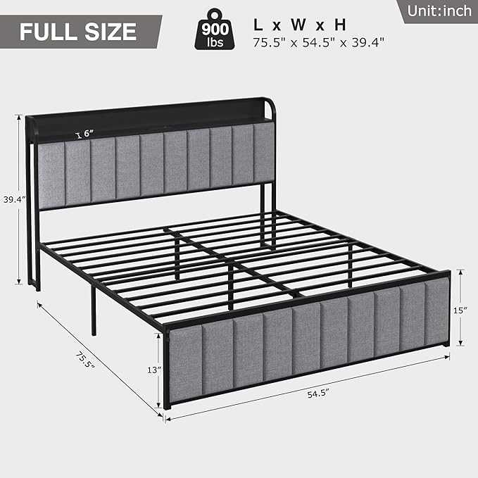 - 【Upholstered Headboard with Charging Station】-This full size bed frame features a built-in charging station, including 2 standard power outlets and 2 USB ports for all your charging needs. Easy to charge your phone, tablet, lamp, humidifier, and other electronic devices.