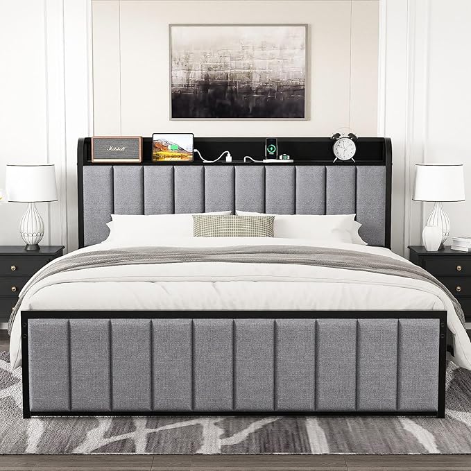 - Material Linen, Metal : Style Bed Frame with Charging Station