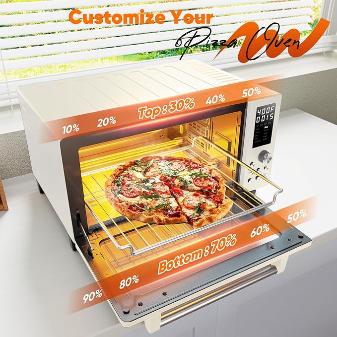 - PIZZA OVEN WITH ON-THE-FLY CUSTOMIZATION - Adjust the convection fan speed and the ratio of top and bottom heaters from 0 to 100% to create different heating zones at any time. For the perfect thick pizza, set the bottom heaters to 70% power and the top heaters to 30% for a crispy crust and perfectly melted, cheesy toppings.