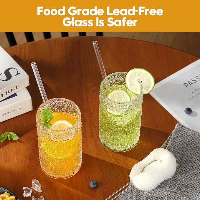 - 【Transparent texture, classic and versatile】 Made of high transparency glass material, lead-free and BPA free, safe and environmentally friendly. The transparent base color combined with retro round nail relief design blends modern simplicity and nostalgic style, making it a practical tableware and exquisite decoration for dining tables and bars, easily adapting to various home styles.