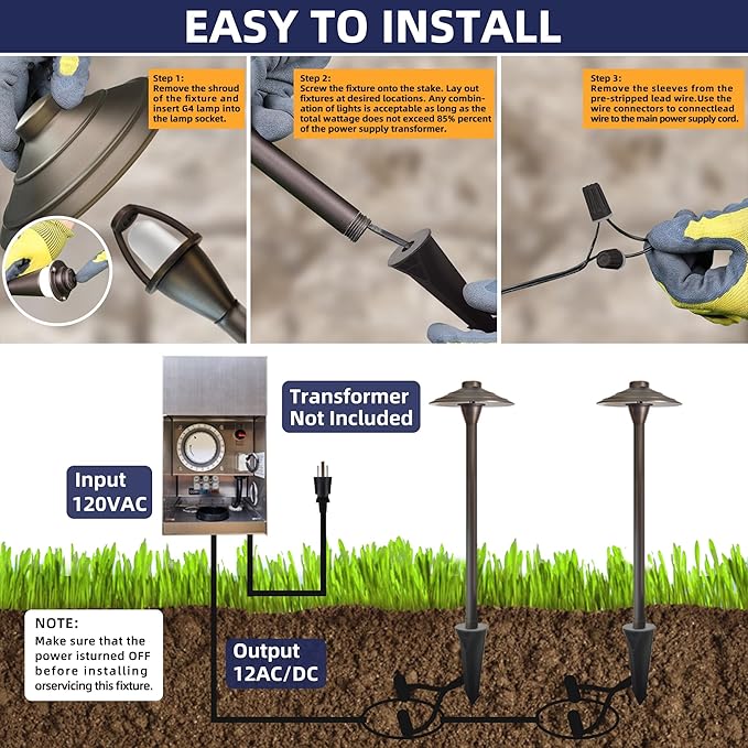 - 【Easy Installation】COLOER Low voltage pathway lights is 12 volt compatible with most low voltage landscape lighting systems. Easy to assemble, you don't need to buy connectors, the included quick-installation wire connector can be easily connected to the low voltage LED landscape path lights; only need to connect the low voltage wires and transformer to complete the installation (low voltage cables and transformers are not included)