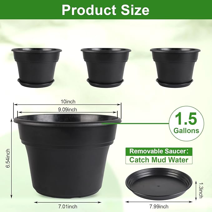 - 【Perfect Size & Sturdy Material】Top Diameter: 10 inch, Bottom Diameter: 7.01 inch, Height: 6.54 inch, Capacity: 1.5 gallon. Flower pot outdoor is made of recyclable plastic, lightweight but sturdy, resist cracking, and wear, UV and weather resistant, making them a reliable option for long-term use. These 10 inch lightweight plant pot designed in rolled rim makes them easy to move and handle.