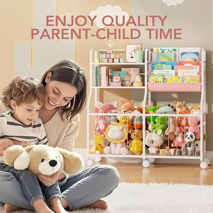 BBLIKE Stuffed Animal Storage Organizer - Rolling Kids Bookshelf and Toy Storage with 3 Tiered Book Display and Toy Chest - Rolling Furniture for Kids Room, Playroom, Bedroom, Nursery, Pink