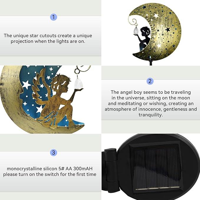 - Solar-Powered Light: Equipped with a built-in solar panel, this angel moon stake charges during the day and automatically lights up at dusk. No wires, no batteries, no fuss—just place it in a sunny spot and enjoy the warm, ambient LED glow each evening