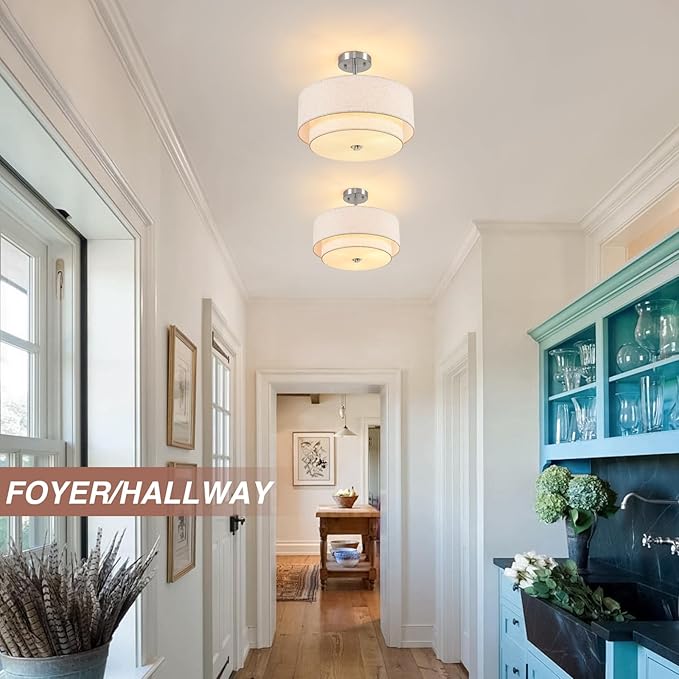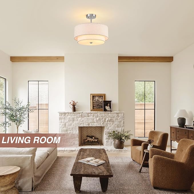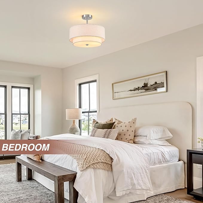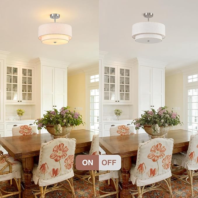 - 【Upgraded Durable Design】This brushed nickel 3-light semi flush mount ceiling light features an upgraded thickened metal frame for lasting durability, paired with a classic beige double drum fabric linen shade—blending robust metal and soft linen for a modern yet timeless look.