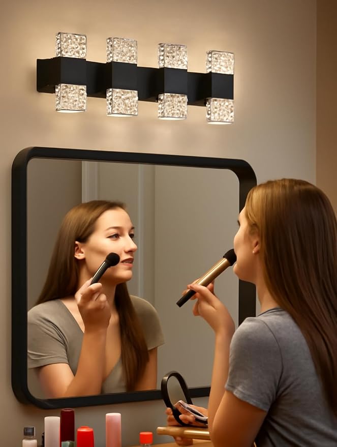 - Elegant Design: Modern bathroom led vanity lights perfect combination of sleek black metal metal base and unique pattern crystal column create a modern yet luxurious aesthetic. When lit, it will cast a warm and beautiful lighting glow. Even when turned off, it can showcase a elegant atmosphere for decoration