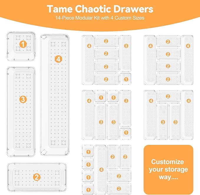 14-Piece Modular acrylic clear drawer dividers and storage bins- 4-Size Clear plastic Drawer Organizer Trays for Vanity,Dresser, Bathroom, Kitchen, Office Gadgets Utensils