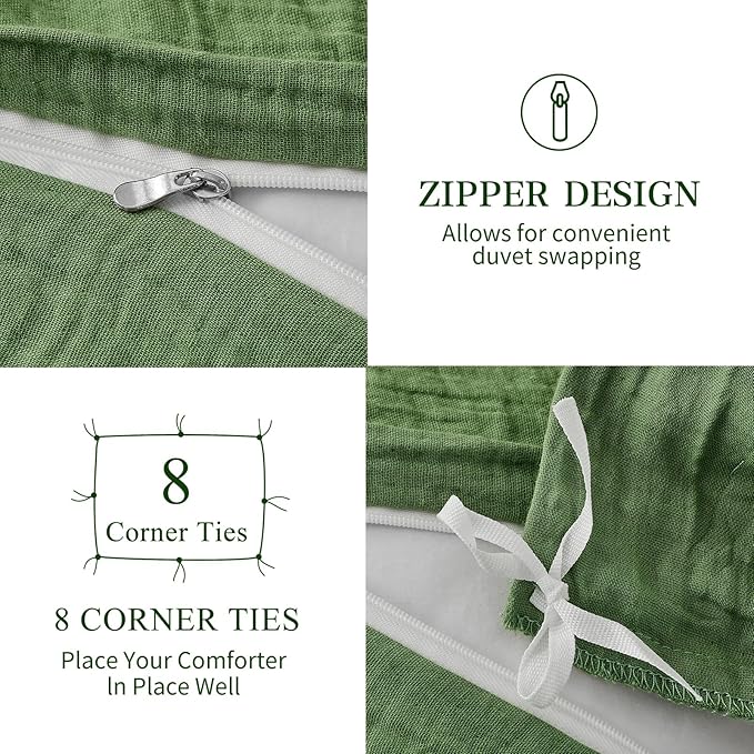 - 8 Corner Ties & Hidden zipper:This Muslin Duvet Cover Designed with practicality in mind, The Hidden zipper closure ensures a seamless look and prevents shifting, enhancing both functionality and aesthetics.