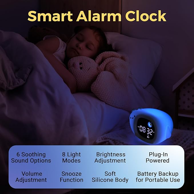- COLOR CHANGING NIGHTLIGHT & SOUNDS – Features 8 nightlight colors and 6 soothing sounds for calm sleep. A color changing alarm clock, quiet kids alarm clock, and sleep helper for nursery, boys, and girls.