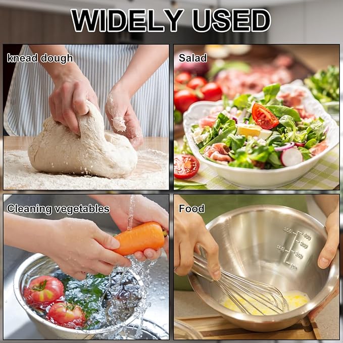 - [Versatile Stainless Steel Mixing Set] Multi-functional tools for whisking, making pancakes, stirring, food prep, serving and storing. ideal for baking, cooking, or DIY recipes.
