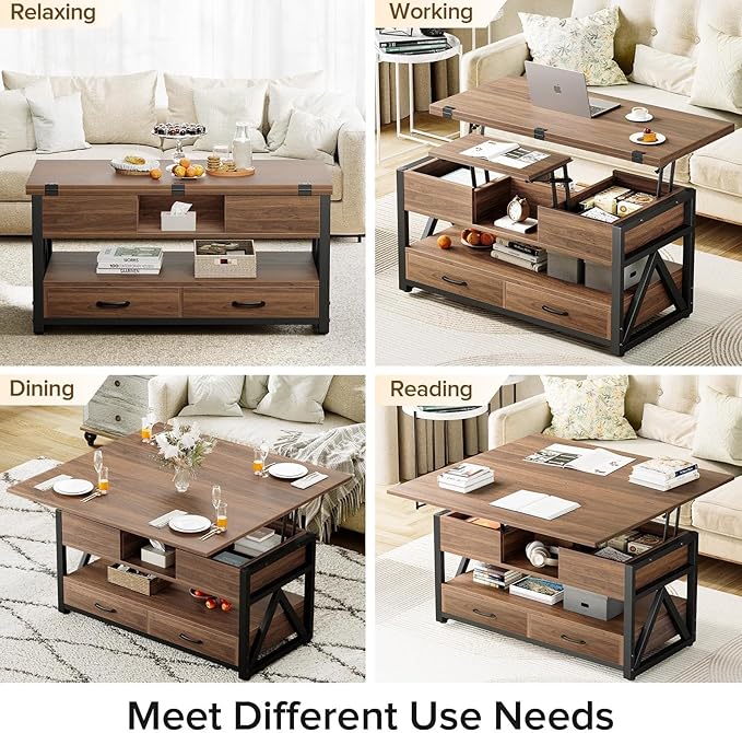 - 【4-in-1 Lift Top Design】Unique lift top coffee table design to meet more needs:when fully unfolded,it becomes a dining or gaming lift coffee table for 4-8 people;when half expanded,it becomes a workstation for 2 people to use at the same time without disturbing each other;when lifting top is closed,Large Storage coffee table is suitable for storing sundries.