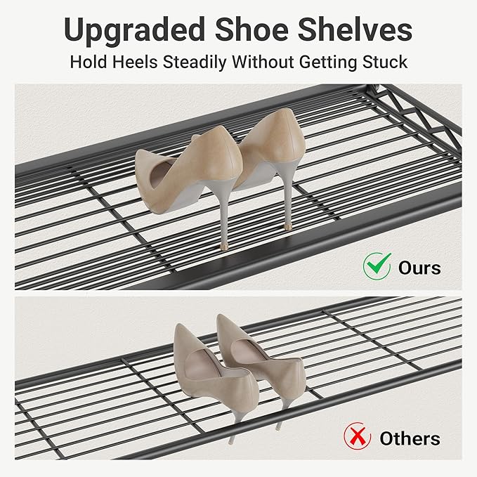 - CUSTOMIZABLE STORAGE: Comes with 2 adjustable shelves and 6 shoe racks for flexible storage of various items. Extra front and back wires on shoe racks prevent heel slipping. Remove one shoe rack piece to make extra space for boots