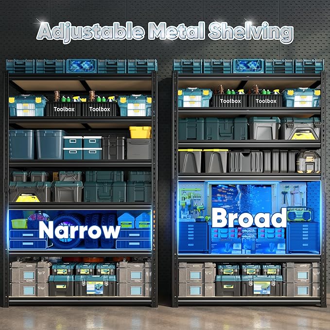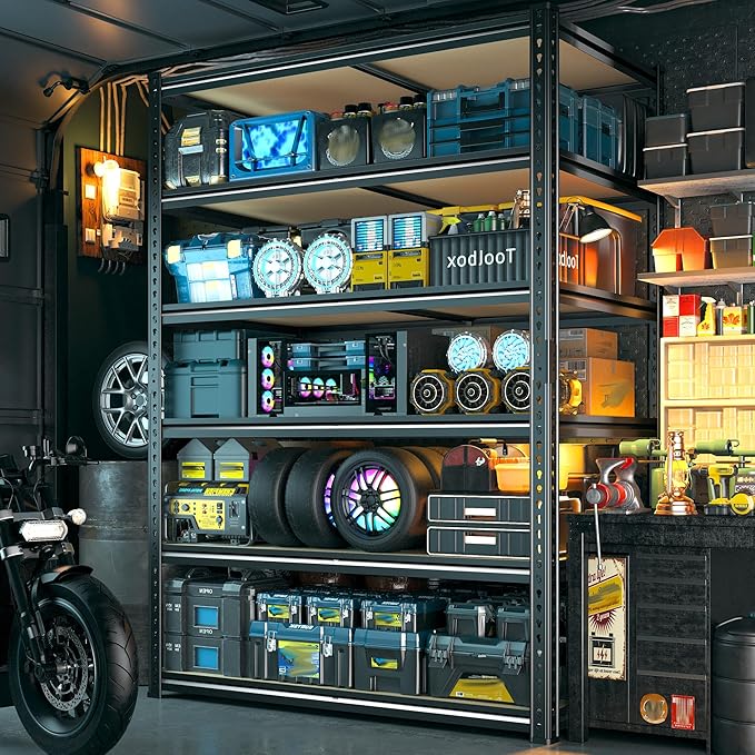 - 【Safe & Sturdy Rolled-Edge Construction】The shelves' thickened steel columns feature smooth edges that protect hands from sharp corners while reinforcing structural durability. The industrial-chic rolled design adds sleek aesthetics to garages, workshops, or pantries — safety and style united