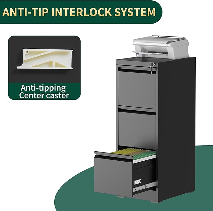 - 【Privacy Security and Anti-tilt Design】The interlock system secures the 3 drawers and comes with two keys to protect your files. The anti-tilt system ensures that only one drawer can be open at a time, preventing the metal file cabinet from tipping over. You can have peace of mind knowing that your important documents and items are safe and secure.