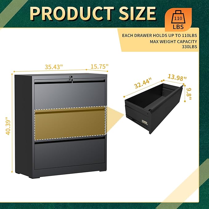 - 【Sturdy Cold-Rolled Steel Construction】Our lateral file cabinet crafted from cold-rolled steel, whole is designed to stay sturdy and does not deform. With a powder coating process that bonds and bakes the protective coating to the bare metal, the file cabinet 3 drawer lateral forms an effective barrier against corrosion. And its reinforced construction supports up to 330 lbs, which can long-lasting for.