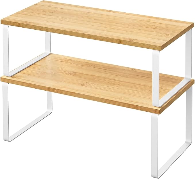 2 Pack Cabinet Organizer Shelves, Stackable and Expandable Kitchen Counter Shelf, for Kitchen Cabinet Countertop Storage, Spice Rack, Metal and Premium Bamboo (White, 15.6" W)