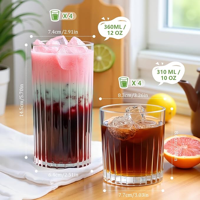 - 【Two-Size Glass Set】This glasses drinking set includes four 15-ounce highball glasses and four 11-ounce rock glasses. These drinking glasses are going to be your favourite kitchenware. They are perfect for juice, water, milkshakes, beer, iced coffee, cocktails, wine and whisky. They are suitable for homes, bars, dessert shops and other places.