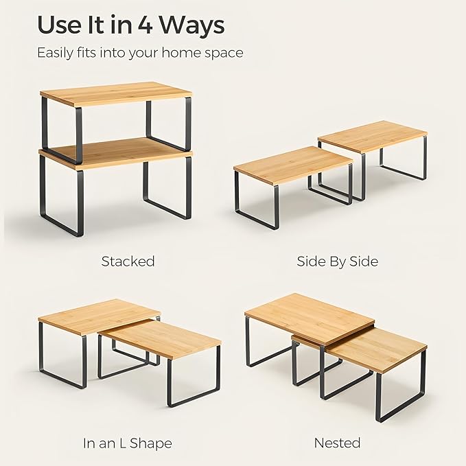 - Adjustable Layout: Features two cabinet shelves of slightly different sizes, designed to be stacked vertically, nested side-by-side, arranged in an L-shape, or used independently. Expand or adjust their width to perfectly fit tight cabinets, countertops, or awkward corners, making them versatile cabinet shelf organizers for any space.