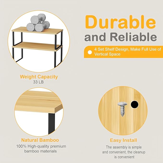 - Strong and Durable & Easy to assemble: Built to last with premium bamboo and reinforced metal frames, each cabinet organizer shelf supports up to 33 lbs, easily assembled in minutes by simply referring to the instructions, ensuring sturdy storage for pantry staples, kitchen gadgets, or bulky cookware. Perfect as cabinet shelf organizers that resist bending or wobbling under weight.