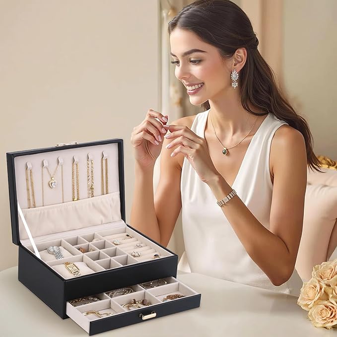- Ample Storage Capacity:Featuring a two - layer design, this large jewelry box offers abundant space. The top layer comes with multiple compartments for earrings, necklace hooks, and a flat area for bracelets, while the bottom pull-out drawer provides extra room for brooches,rings, earings and other jewelry items without tangling. Ideal for large collections and keeps valuables dust-free.