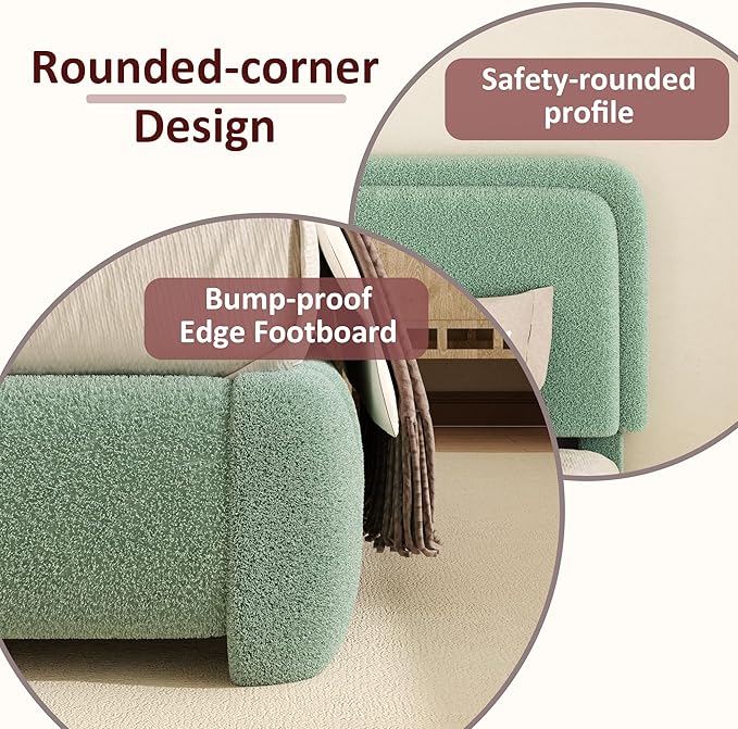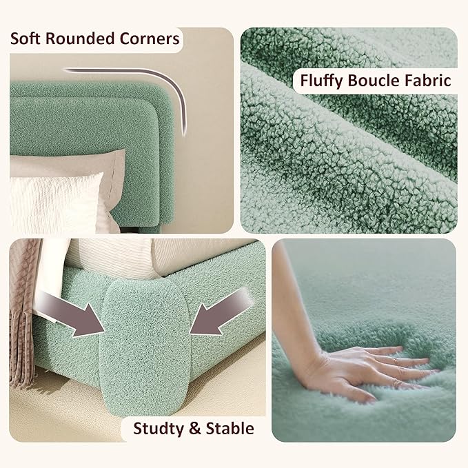 King Boucle Platform Bed Frame with Height Adjustable Headboard, Modern Upholstered Cloud Bed, Sleek Curved Design, No Box Spring Needed, Easy Assembly, Noise Free, Green