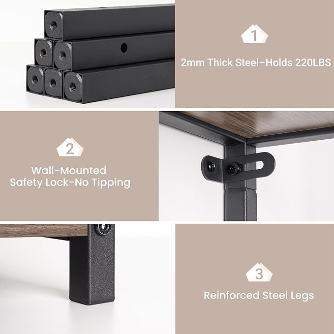 - 【Enhanced Safety Features】Includes anti-tip brackets and wall anchors for added stability. The reinforced metal frame supports up to 30 lbs per shelf, ensuring secure storage for your belongings