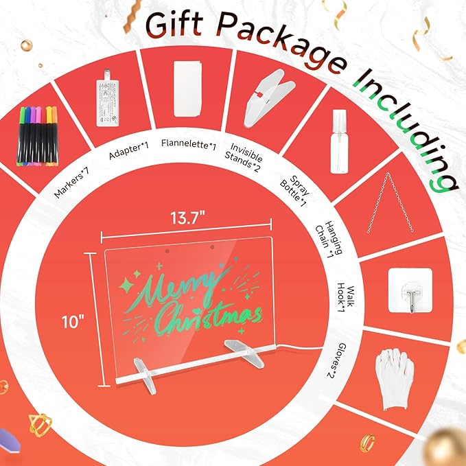 - 2.Stunning Gift Parcel:Unbox joy! Includes 7 vibrant markers for kids’ instant creativity, 2 soft cotton gloves to avoid prints, a flannelette + spray bottle for easy cleaning. Hang led drawing board with colors with the sturdy sticky hook & chain, or prop drawing board for kids up with 2 hidden stands—effortlessly transform art into striking wall decor or a stable desktop easel