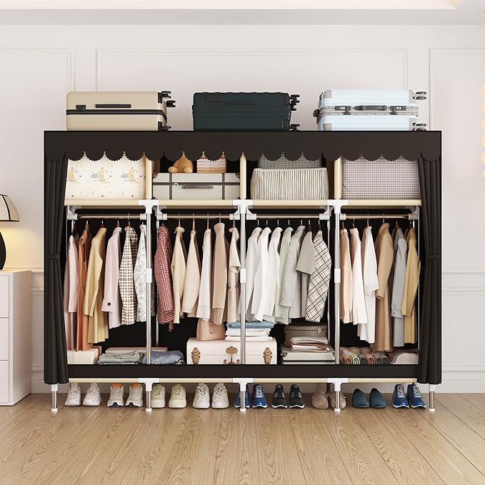 - 【Multifunctional Storage Solutions】: This Multifunctional portable wardrobe features 4 spacious lockers , perfect for organizing clothes, scarves, pants, jewelry, socks, towels. Besides 4 dedicated hanging areas for long skirts, dresses, and suits, The top section accommodates suitcases and large storage boxes, while the bottom is perfect for shoes. Effortlessly load and unload your items for effortless organization!