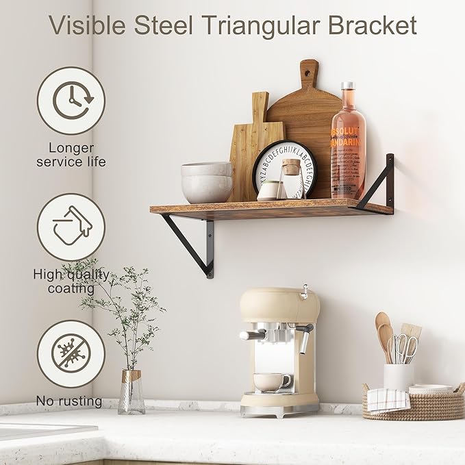 - 【FARMHOUSE RUSTIC WALL SHELF】These floating shelves are made of premium engineered wood board and visible triangular bracket. The rustic wooden grain surface add character and warmth to any modern or traditional interior with these deep floating shelves, contrast shelves at staggering heights on the wall or mount side-by-side or in the corner for a clean streamlined look.