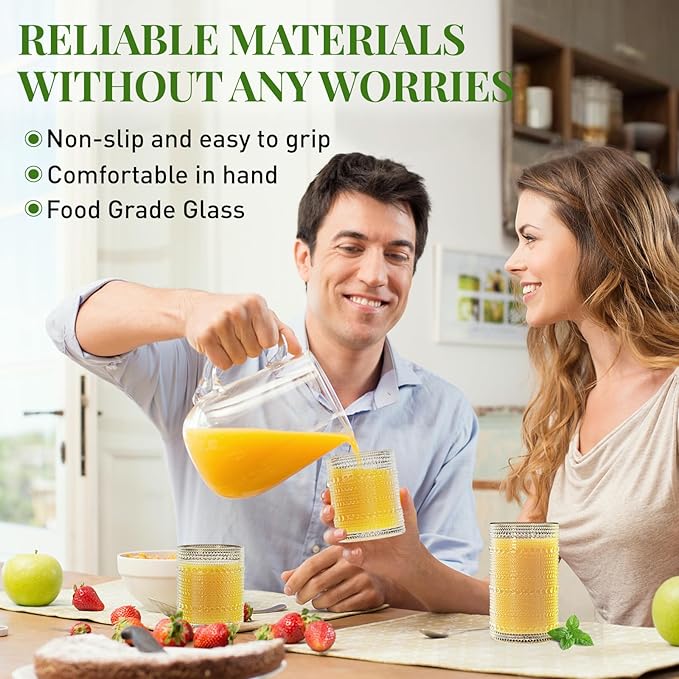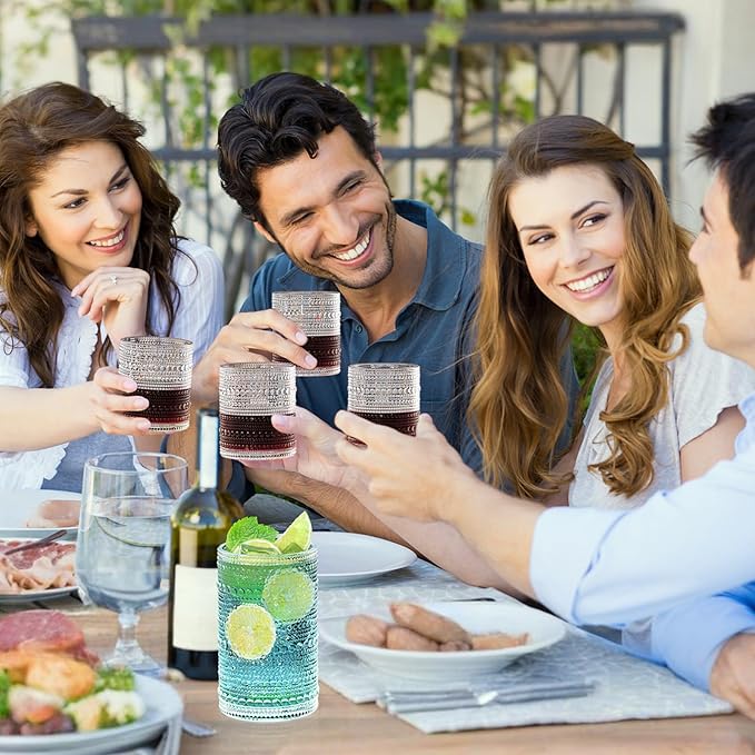 - The glass tumblers drinking glasses features an exquisite embossed design. The unique embossed bead design evokes a European retro style, and each glass is thick, elegant, and pleasant to the touch. The embossed texture not only enhances the glass's aesthetic but also provides a comfortable and secure grip, making it the perfect choice for both casual gatherings and special occasions.
