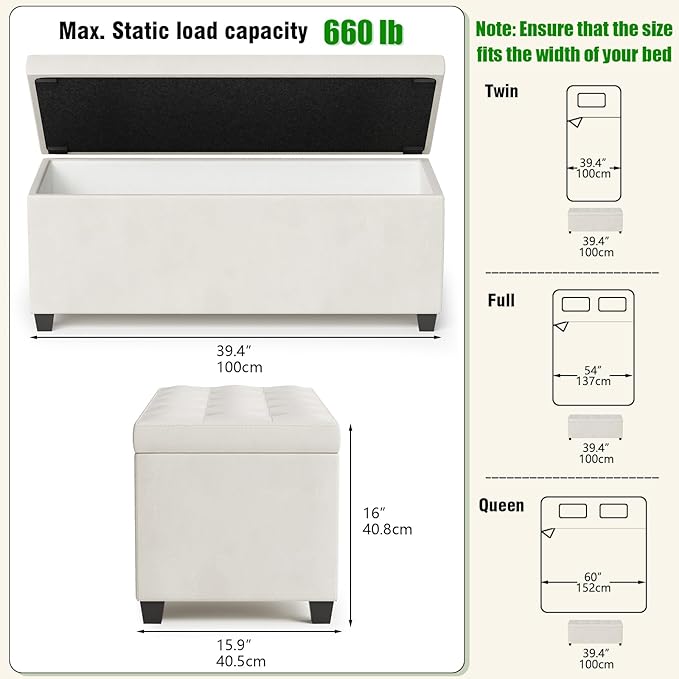 - 【GENEROUS STORAGE CAPACITY】With dimensions of 15.9"D x 39.4"W x 16"H (40.5 x 100 x 40.8 cm), the bench provides ample storage space for linens, pillows, books, and more.