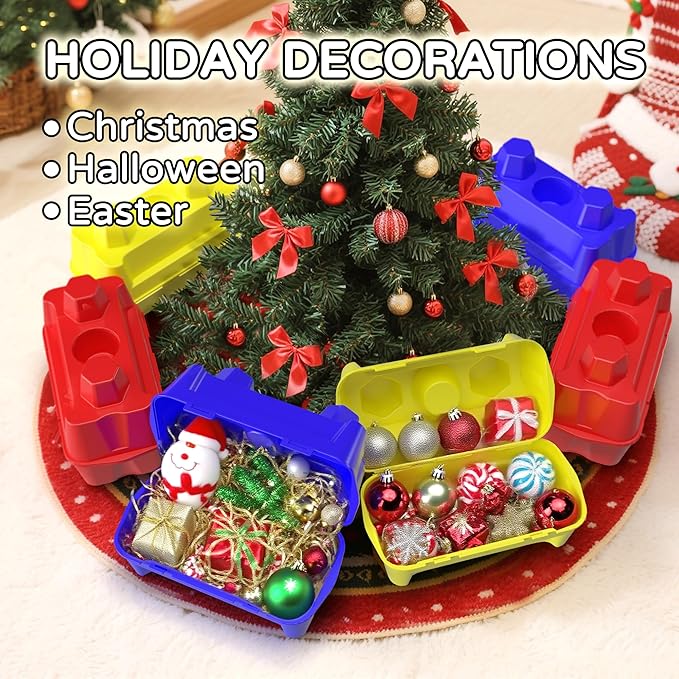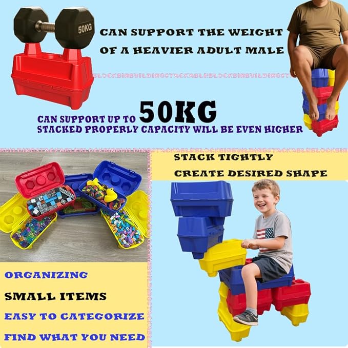 - Stackable toy box with storage functionality, featuring 12 stackable storage bins in red, blue, and yellow. Is it because your child has too many small items that it becomes difficult to find them when you put them away? Quickly sort them into neat categories.