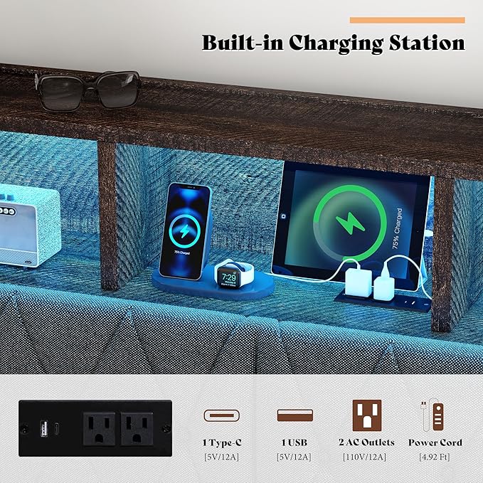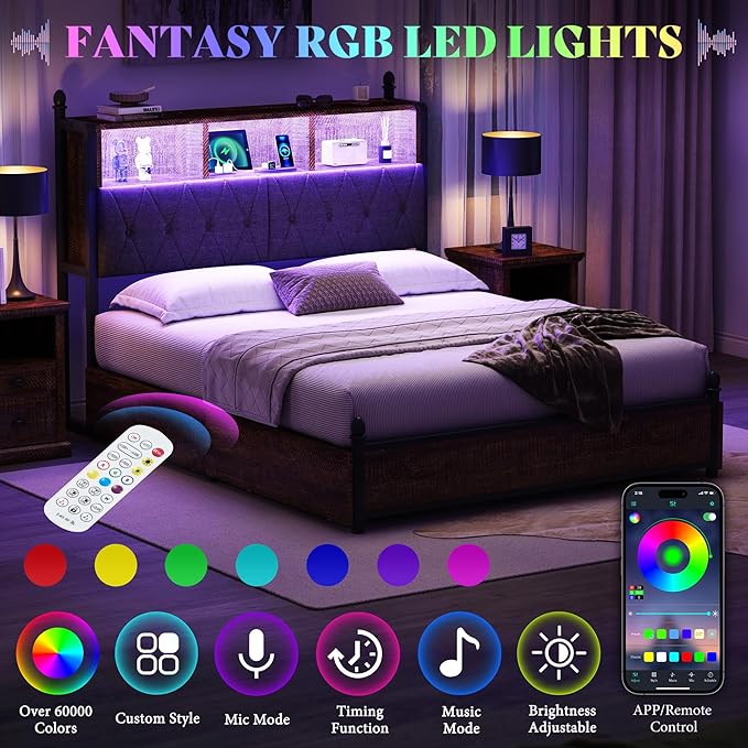 - 【INCLUDED CHARGING STATION & LED LIGHTS】The bedframe cleverly integrates 2 AC outlets & 1 USB port and 1 Type-C port to meet your electronic device charging needs. Multi-color RGB LED lights create a personalized atmosphere