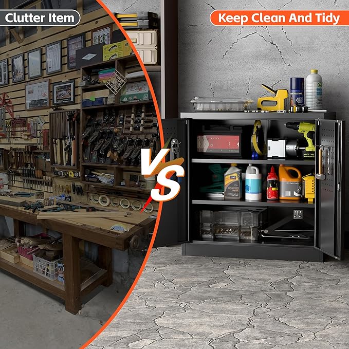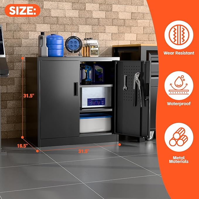 - 2 Shelves and 4 Hooks:The newly upgraded 31.5 "H cabinet features 2 adjustable partitions. The door is equipped with pegboards, allowing for the hanging of 4 hooks to hold tools, and more. Meeting different usage requirements