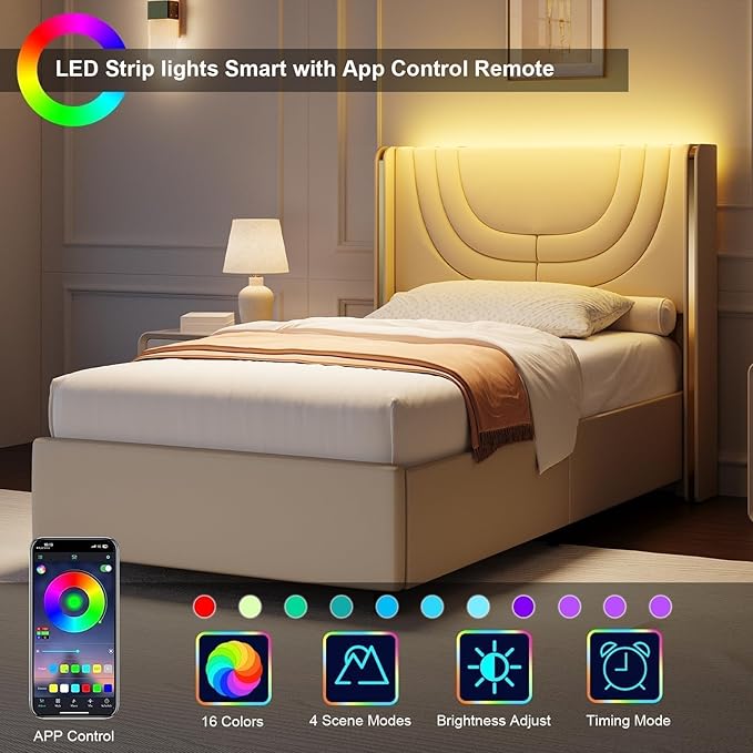 - 【16-Colour APP-Controlled LED Headboard】Tailor your ambience with this bed frame's 16-colour LED lighting system. Control the brightness and modes via a dedicated mobile app to create the perfect reading light or relaxing atmosphere