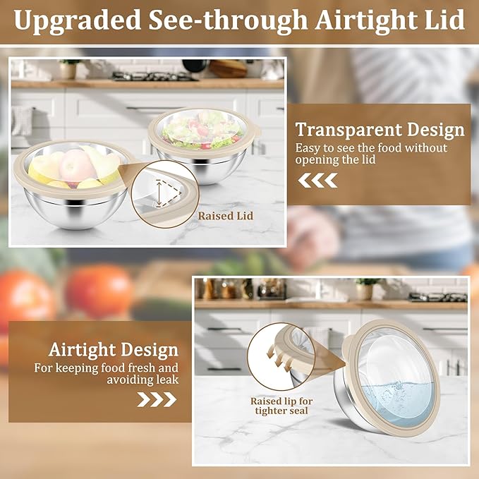 - 【Upgrade Visible Airtight Lid】 Each metal mixing bowl comes with a visible lid, Allows you to easily see the contents without opening it, The lid silicone side is completely wrapped around the bowl and not warp easily, Keep your food fresh and avoid food spilling and leaking, Raised lid design to provide more capacity for food storage and will not squeeze foods, And the protruding handle makes the lid easier to open