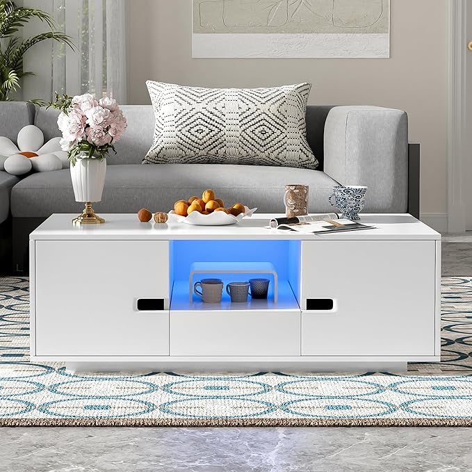 Modern High Gloss LED Coffee Table 47.2-Inch Wooden Center Cocktail Table with Storage & 16 Colors LED Light for Living Room, White