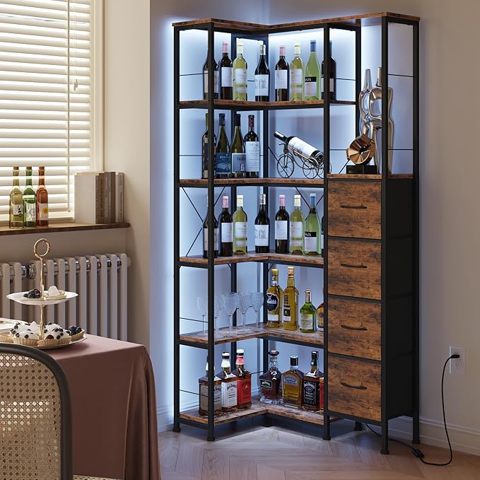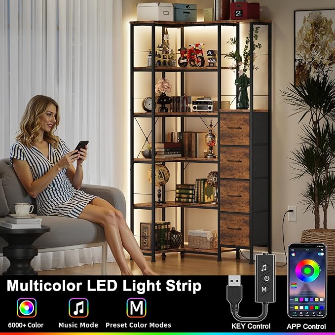 Corner Bookshelf with LED Light Strips & 4 Fabric Drawers, 6-Tier Convertible Corner Shelf with Display Shelf, Large Wood Industrial Bookcase for Living Room, Bedroom, Home Office, Rustic Brown