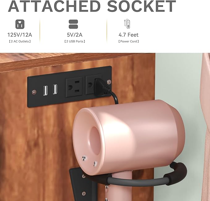- Power Up Your Space: Stop searching for outlets; This vanity has its own built-in power strip with outlets and USB ports, plus a handy rack for your hair dryer or curling iron