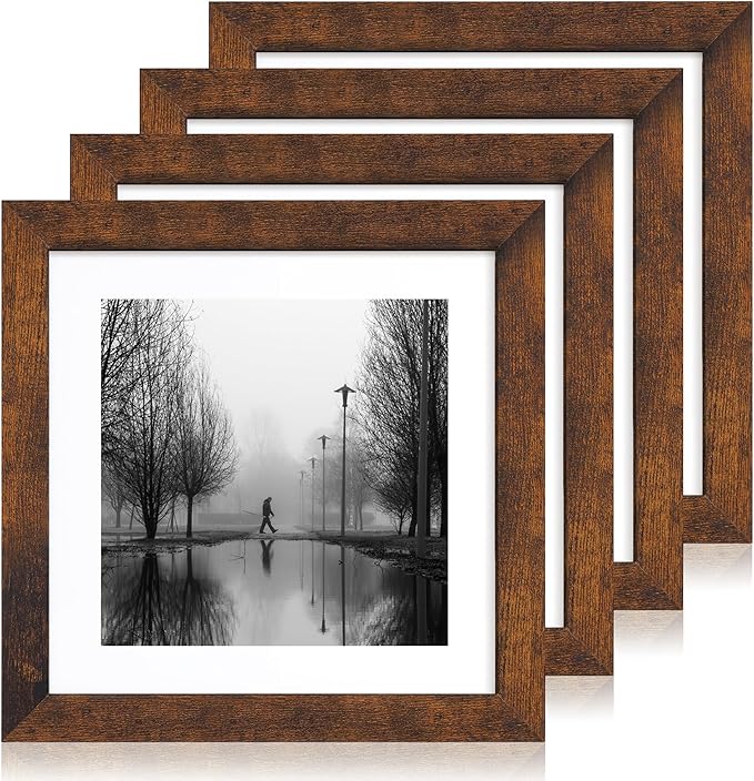 10x10 Picture Frame Set of 4 with Real Glass, Rustic Frames Display 8x8 Picture with Mat or 10 x 10 Without Mat, Wooden Square Photo Frame for Wall Mount and Tabletop Display